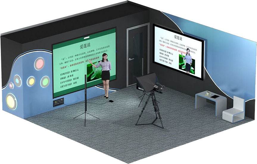 ●1.老师站在绿幕前方,我们将PPT通过投影机投射至绿幕,为老师讲课做提示 。